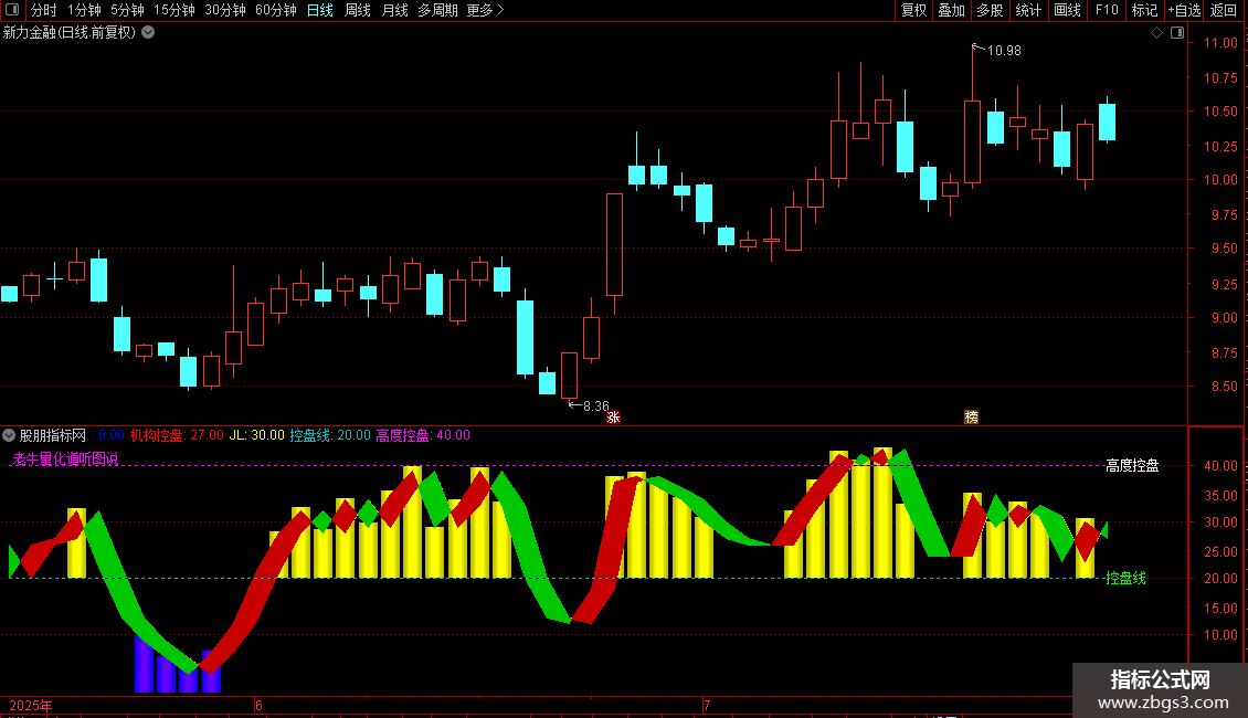 4. 使用柱状图和色带直观显示主力控盘力度的变化。