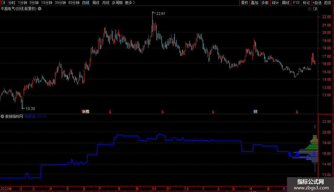 输出筹码峰:如果MX6=A1,返回HB,否则返回如果MX6=A2,返回B31,否则返回如果MX6=A3,返回B32,否则返回如果MX6=A4,返回B33,否则返回如果MX6=A5,返回B34,否则返回如果MX6=A6,返回B35,否则返回如果MX6=A7,返回B36,否则返回如果MX6=A8,返回B37,否则返回如果MX6=A9,返回B38,否则返回如果MX6=A10,返回B39,否则返回如果MX6=A11,返回B310,否则返回如果MX6=A12,返回B311,否则返回?,线宽为2,画蓝色