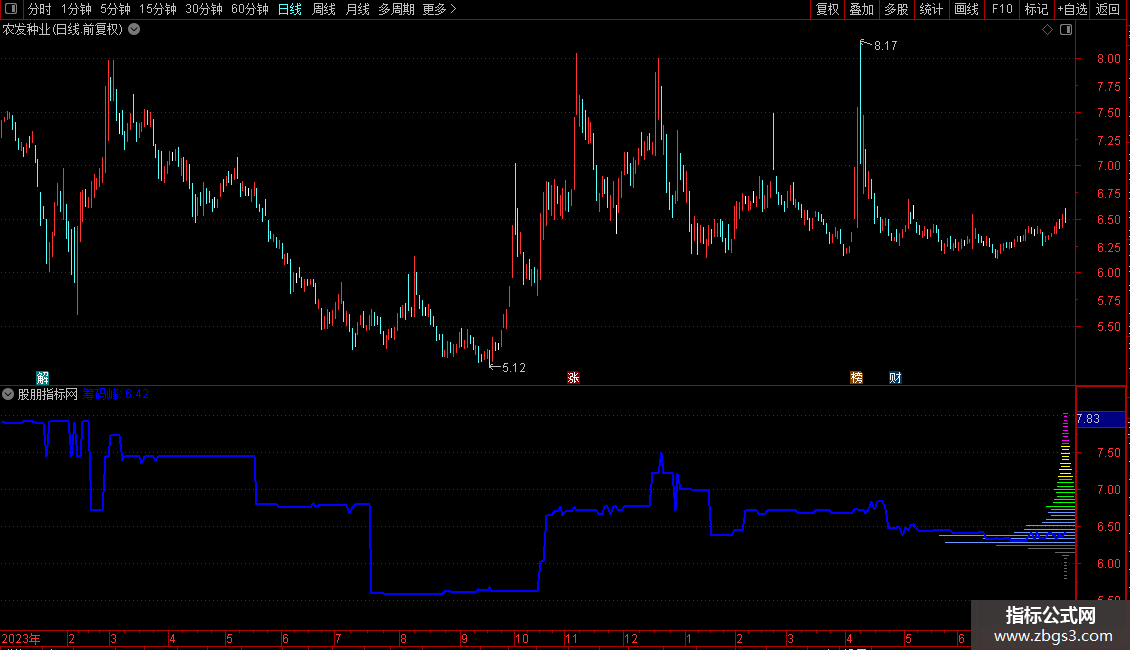 用法:主图叠加指标。观察蓝色“筹码峰”线的位置,可判断当前市场的主要持仓成本区域。结合股价与筹码峰的位置关系,分析支撑与压力。