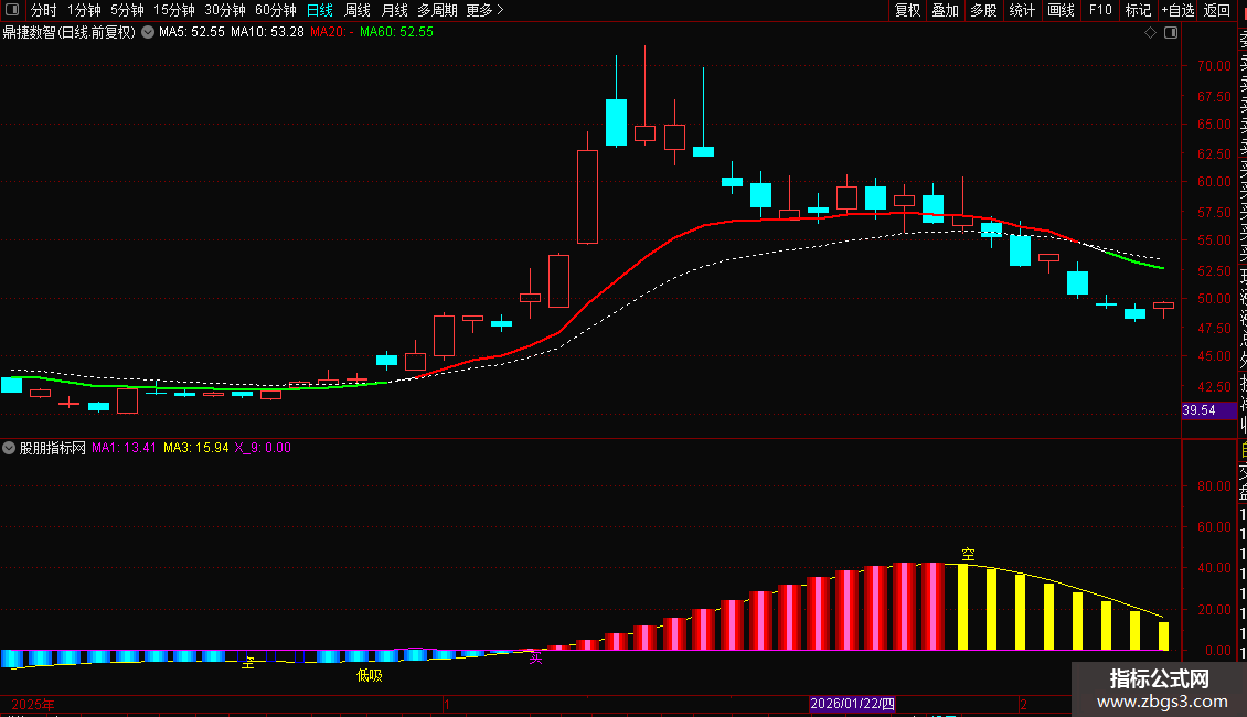 副图通过“主力动向”与MA1/MA3交叉信号,识别主力动向及“低吸”“买”时机,搭配RSI超买预警。