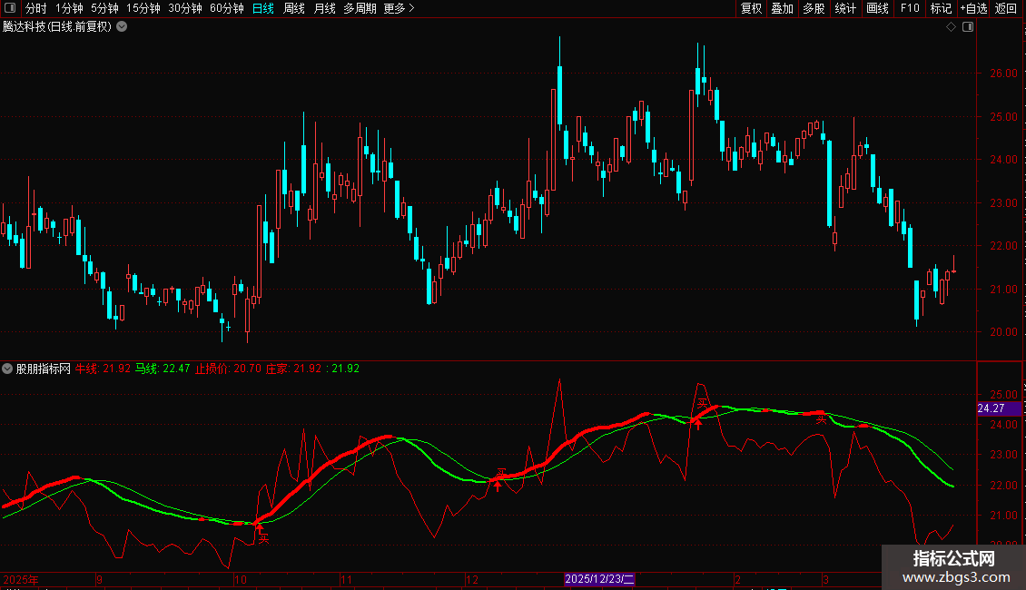 5. 庄家线:其计算与牛线完全相同,但通过颜色和粗细变化直观显示其涨跌:上涨时用红色粗线标示,下跌时用绿色细线标示。