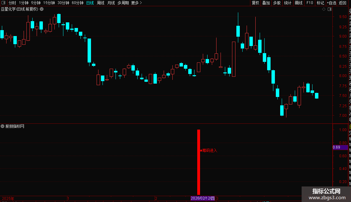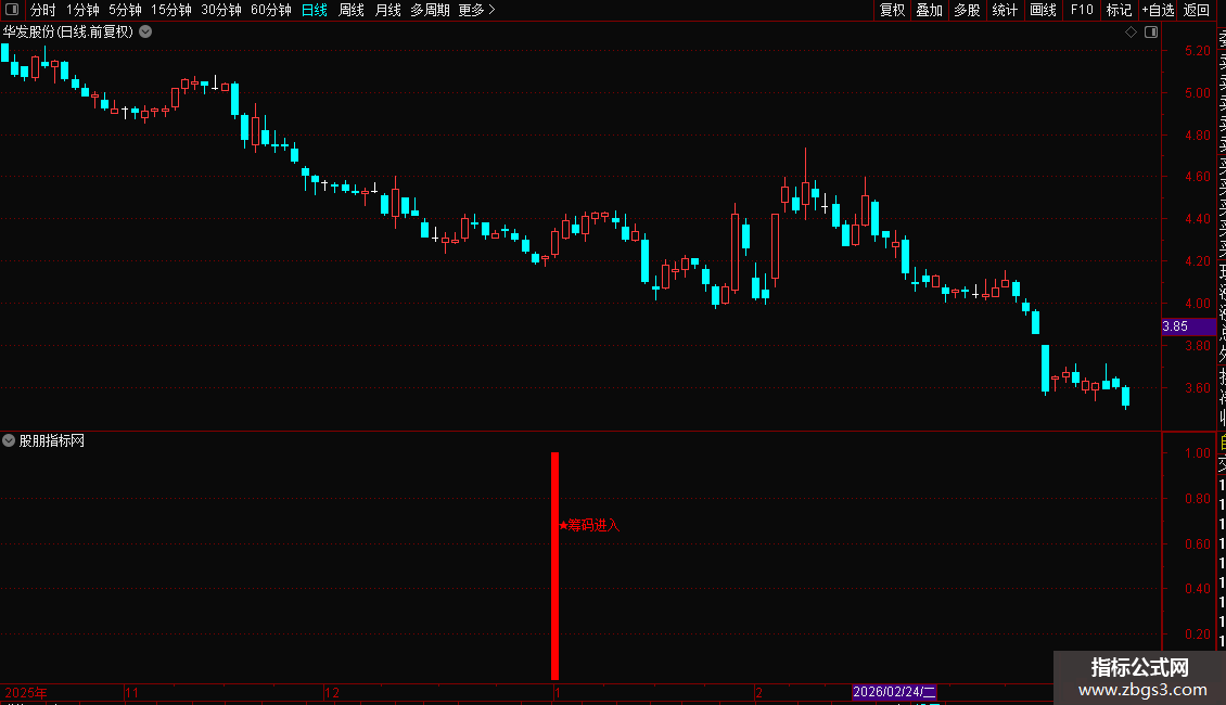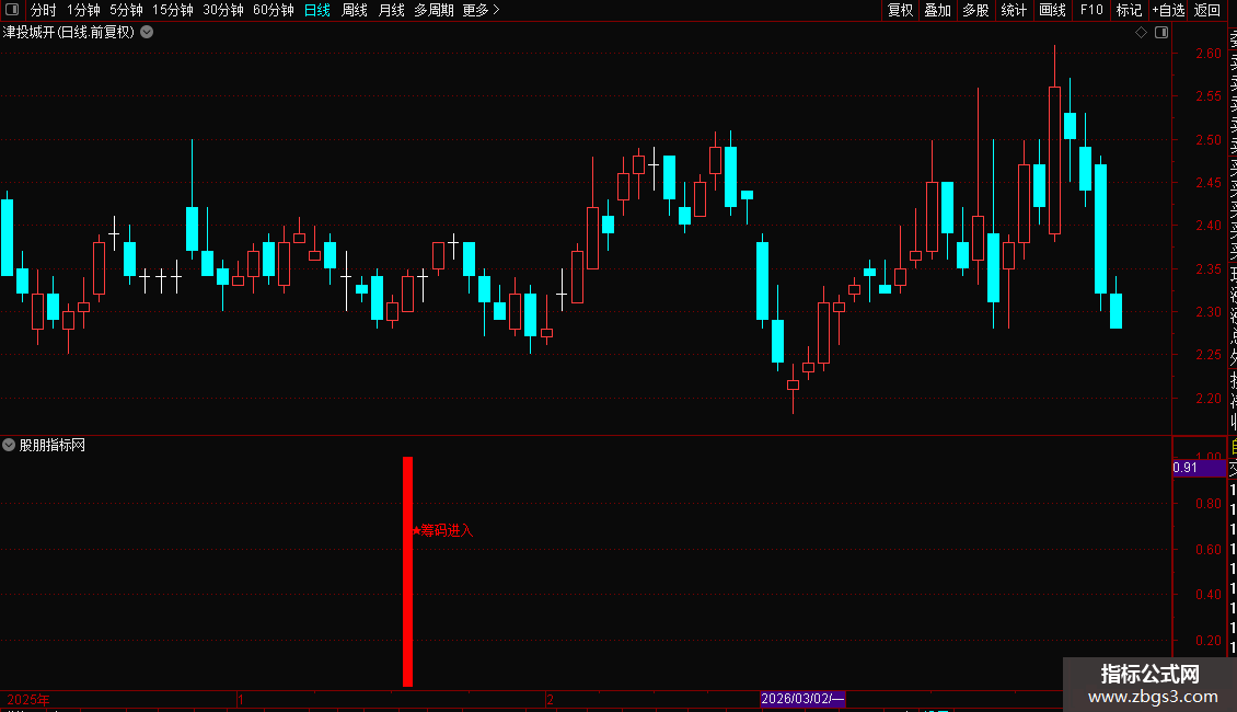 当股价处于长期低位,且出现放量上涨(涨幅超过3%)的阳线时,指标会在副图发出“★筹码进入”的红色信号。这通常意味着主力开始进场吸筹。投资者可将其作为左侧交易的参考,在信号出现时关注,并结合其他指标确认趋势反转。