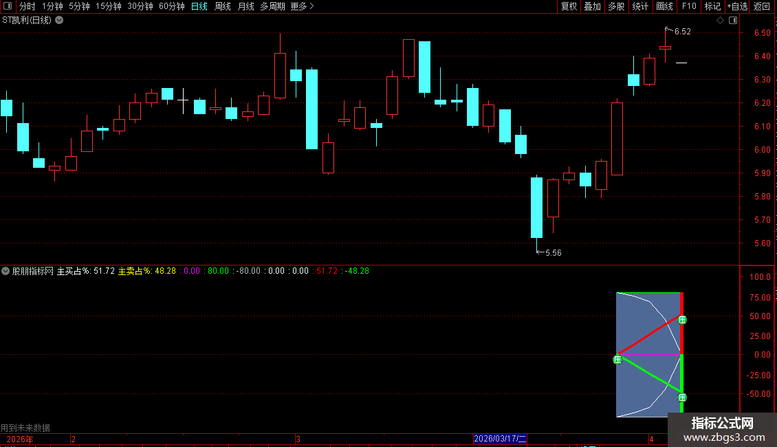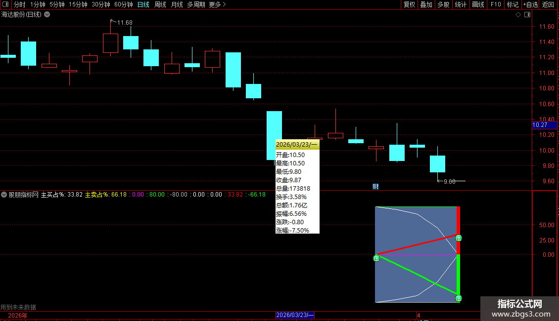 这是一个用于分析个股分时图中主力资金流向的指标。它通过计算主动买入和主动卖出的成交量占比,并以图形化的方式在分时图下方展示。
