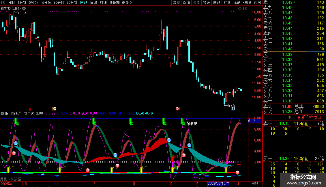 买入参考:当出现“短牛”、“中牛”、“大牛”信号柱,且价格位于`DOWN`线之上或突破`UP`线时,可作为关注或介入的参考。同时可结合周线KDJ的金叉图标进行验证。