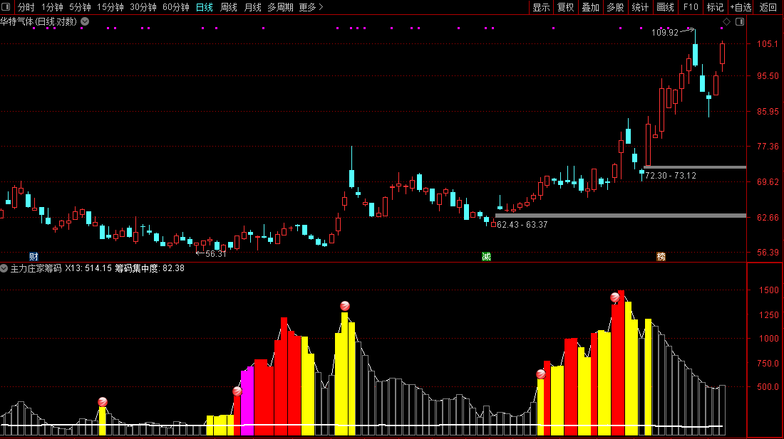 紫色:通常意味着吸筹已进入后期,筹码高度集中,股价可能随时启动。紫色柱出现后,往往伴随着缩量,是“拉升前最后的寂静”。