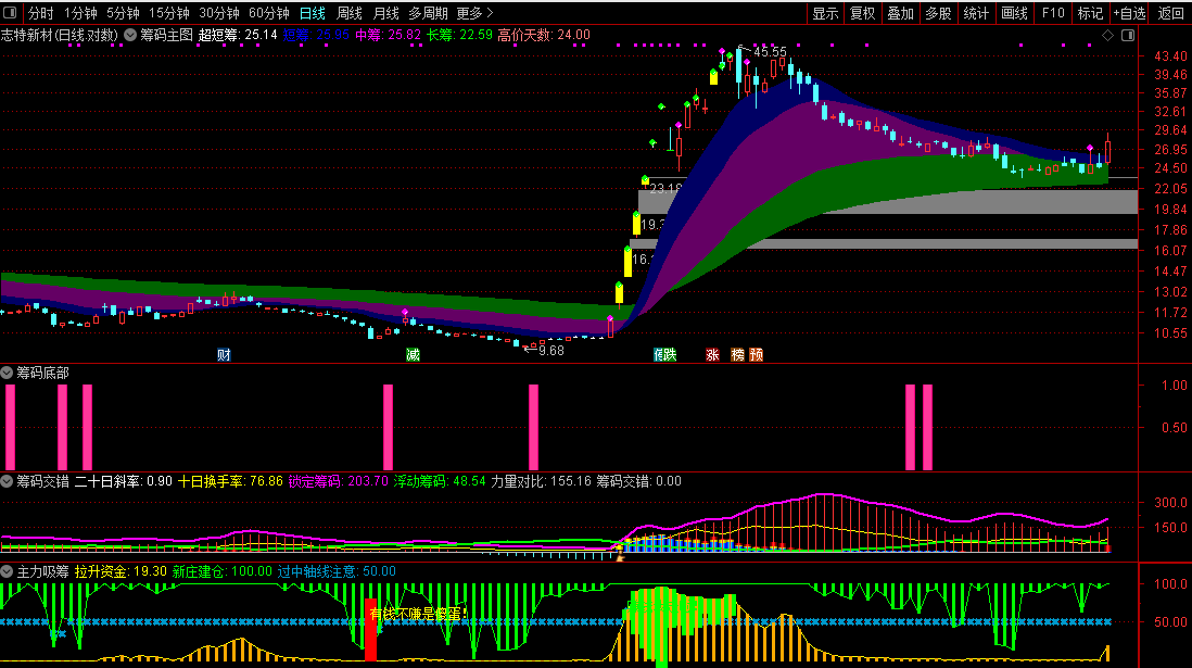 趋势确认:当获利筹码线稳定在亏损筹码线上方,且主力筹码线高于散户筹码线时,表明多头趋势健康,主力占据主导。