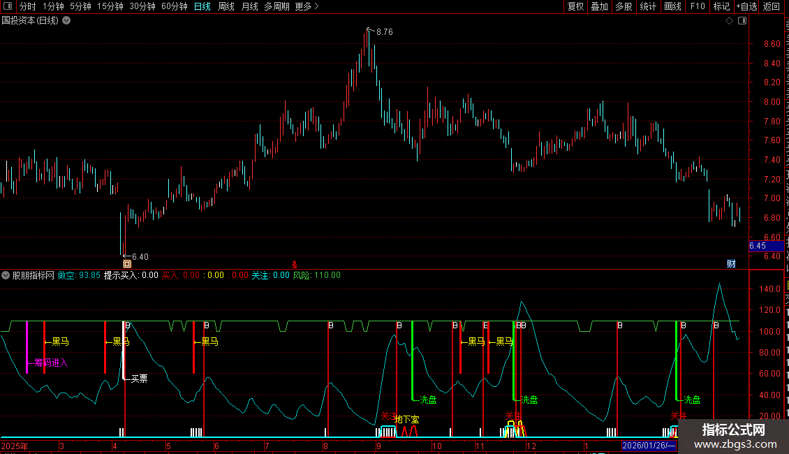 1. 副图公式:加载至通达信K线副图,白色“买入”柱+“B”为基础买点,黄色“黑马”提示强势启动,绿色“洗盘”建议观望,紫色“筹码进入”可低吸,青色“出逃”需止盈;