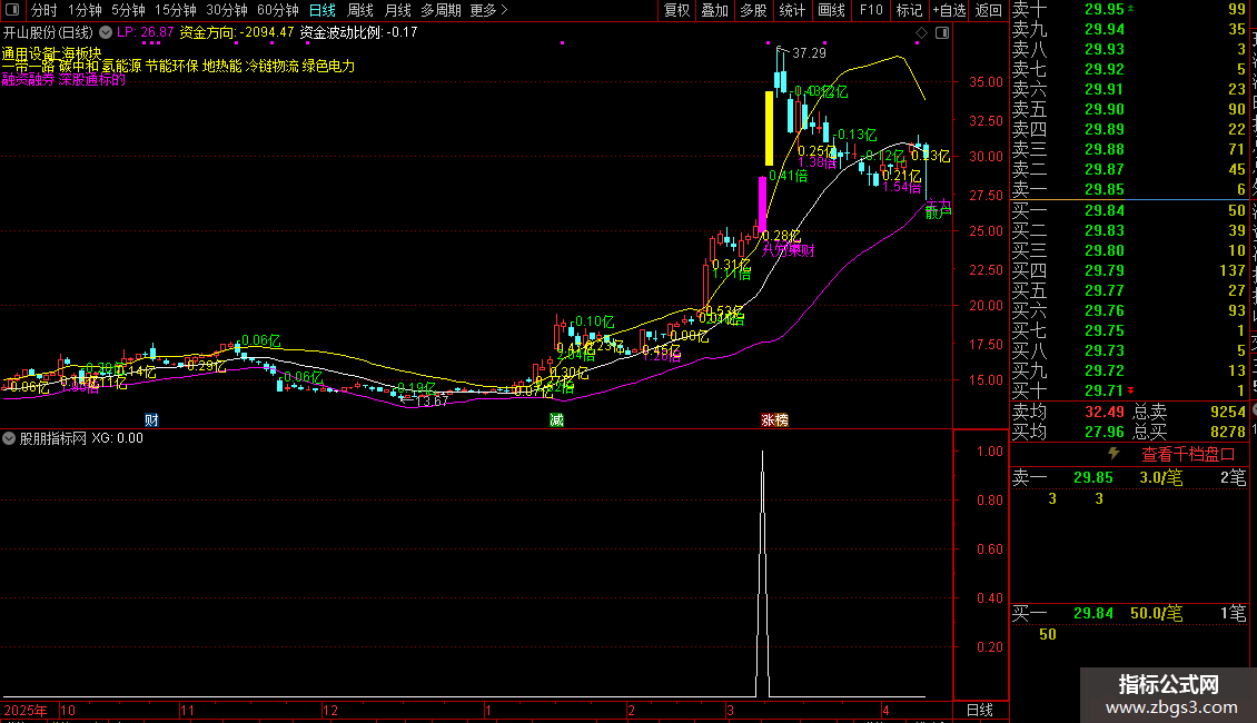 指标提供涨停板标识功能,以黄色K线标注普通涨停与一字涨停。同时监控资金流向,区分主力资金与散户资金,计算净流入额。还包含布林线通道,基于20日均线计算上下轨,辅助判断行情趋势。