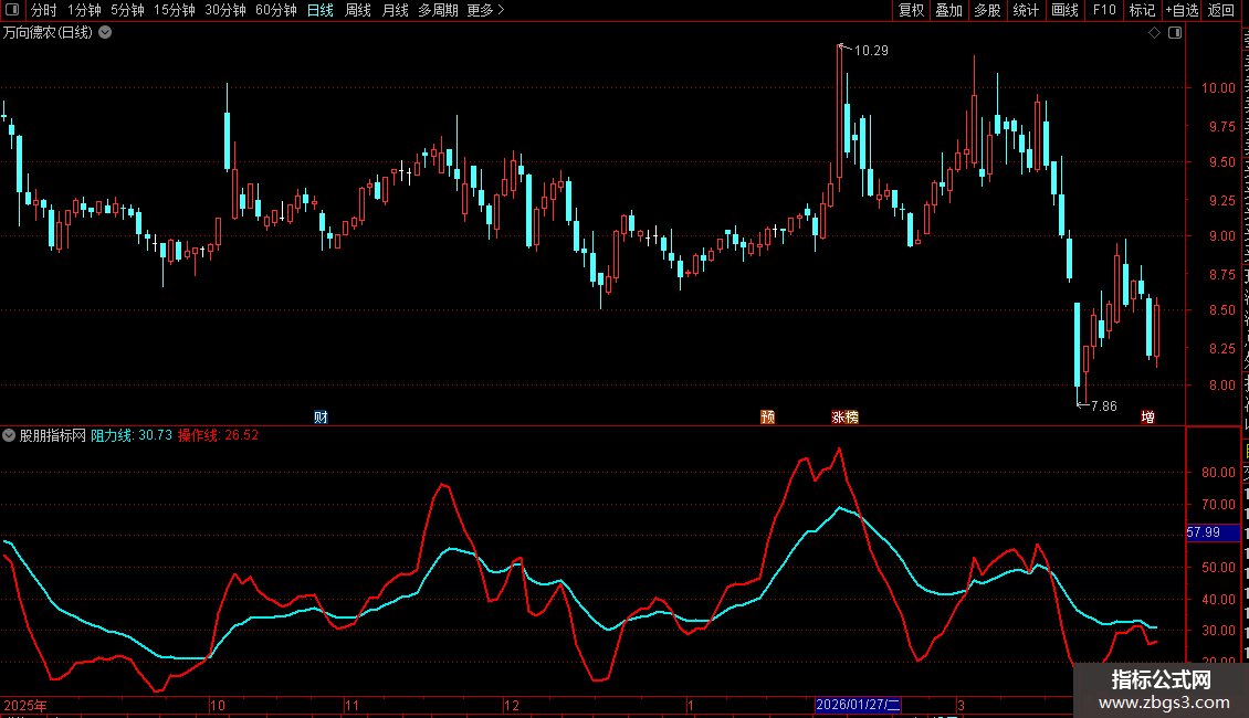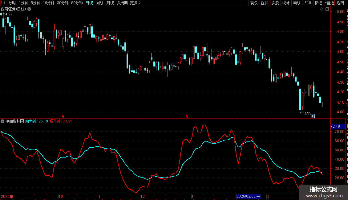 使用方法:通常观察两条线的交叉与方向。当短期操作线上穿长期阻力线时,可能预示向上突破的买入机会;反之,下穿则可能预示走弱。同时,可结合指标线自身的超买超卖区域(如接近100或0)进行判断。