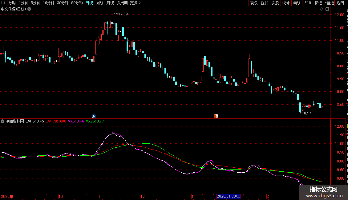 4. 均线系统:叠加了5日、25日简单移动平均线(MA)以及5日、29日指数移动平均线(EXPMA),用于判断趋势和支撑压力。