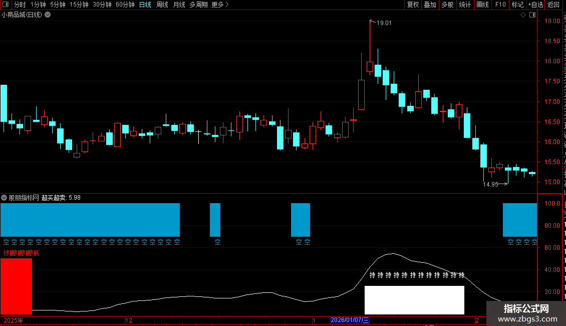 `超买超卖`线高于某一数值(如80)时警惕超买,低于某一数值(如20)时关注超卖。
