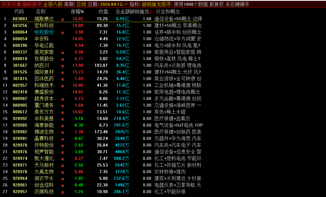 使用方法:早盘9:25后运行公式选股,或者.401按"破晓擒龙"值排序,破晓擒龙=1,即为主力抢筹明显、技术形态健康的重点关注对象。 建议结合大盘情绪与板块热度综合判断,优先选择热门题材中的小盘绩优股,严格执行止损纪律,次日不涨停即择机离场。