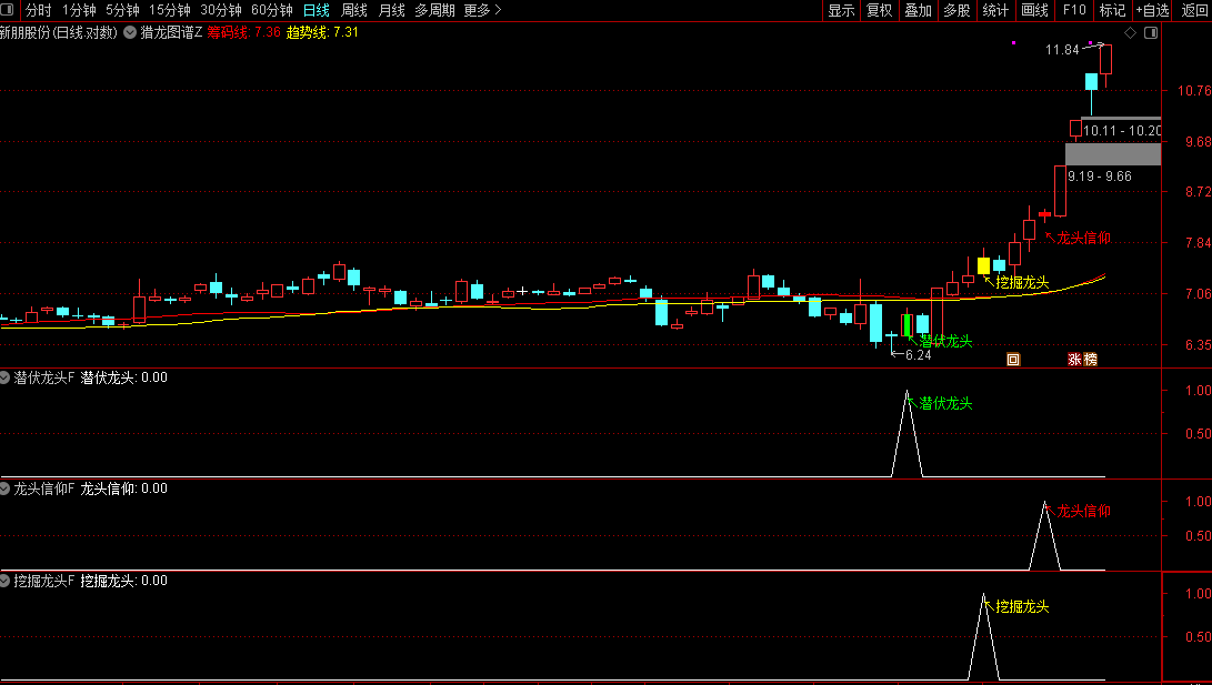 “挖掘龙头”(黄色信号)适用于短线突破操作,