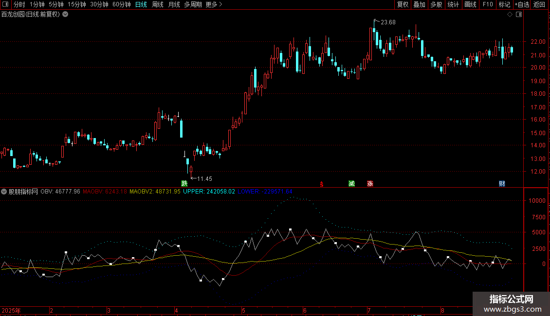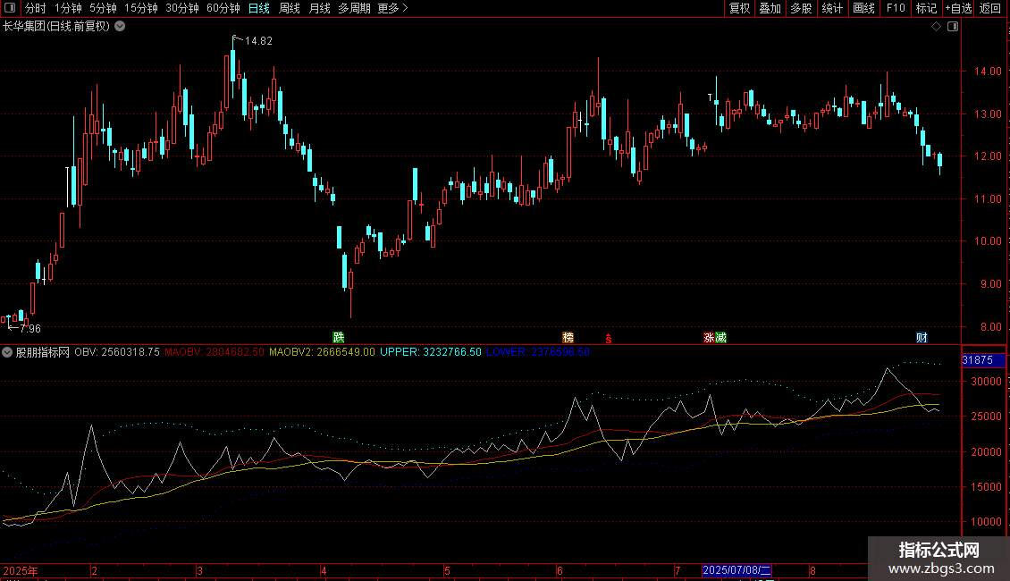 1. OBV能量潮:基于成交量与价格关系判断资金流向,附带15/30日均线及布林带上下轨。