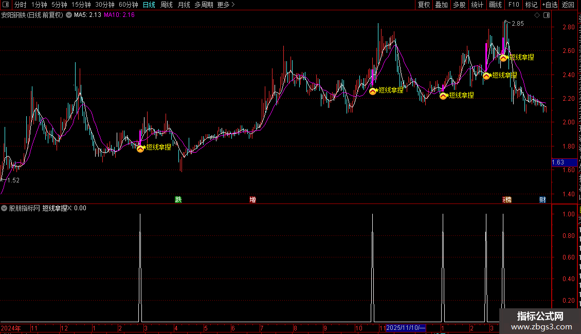 1. 主图指标:导入通达信后加载,出现粉色信号柱+黄色★图标+文字提示,即为短线介入信号;