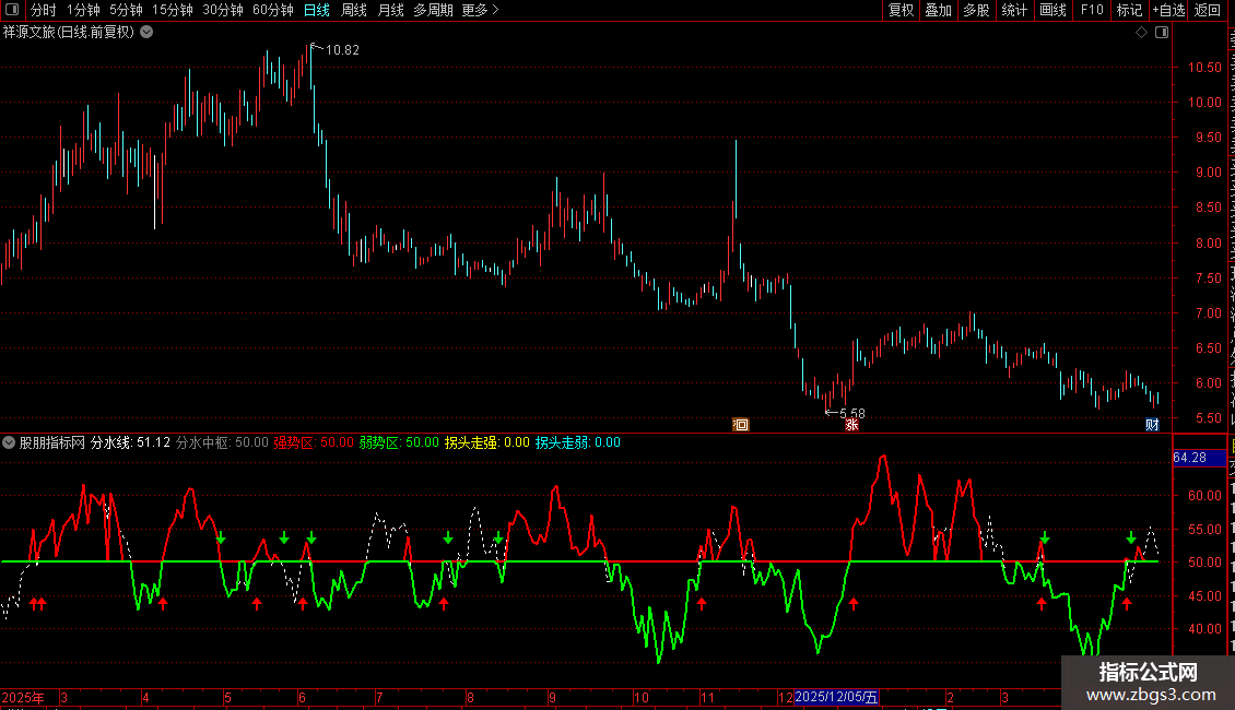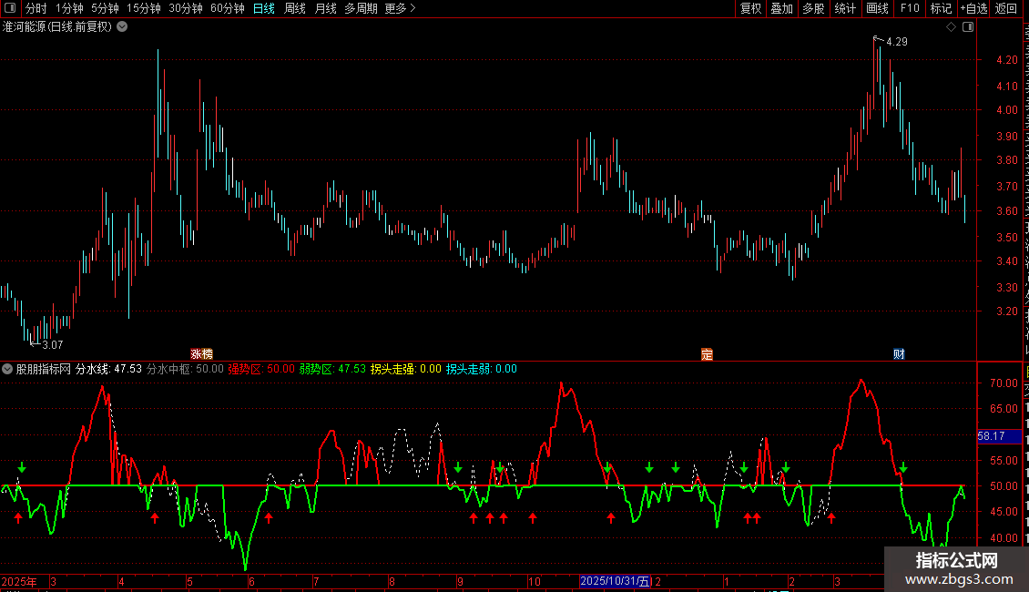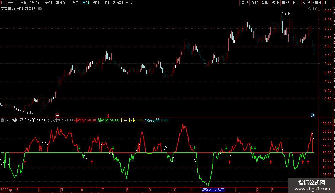 功能核心:指标通过计算价格在当日波动区间中的相对位置,形成一条"分水线"。当分水线在中枢上方且价格位于均线上方时,显示为强势区域;反之则为弱势区域。