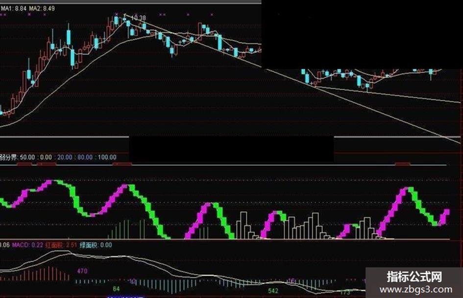 STICKLINE(REF(趋势,1)< 趋势, 趋势,REF(趋势,1),5,0),COLORFF00FF;
