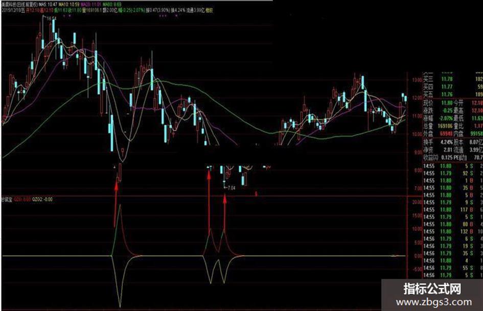 QZG: EMA(IF(LOW<=VARE,(VARD+VARF*2)/2,0),3)/618*VAR10, COLORRED;