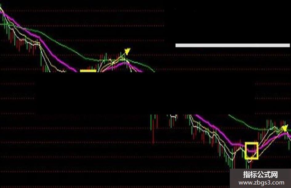 绿色线:——生命线,当K线突破绿线向上,多头行情,反之空头行情 紫色线:——平仓线,这个比较重要,上涨行情只要跌破紫色线就必须平仓操作!绝对不能等不能靠!下跌行情的抄底只要不突破紫色线就不进场! 黄色线:——多空线,我们买入一只股票一开始介入的周期。 白色线:——压支线,同理黄色线,不过周期缩短一半,用于超级短线,寻找个股的 支持和压力! 具体例子: 生命线:上图方框当中指的是跌破绿线进入空头行情,圆圈标注的是突破绿线进入多头上涨的行情