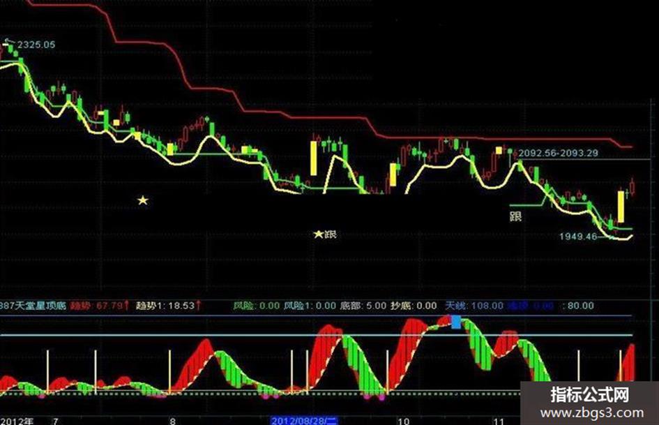 DRAWTEXT(CROSS(买线,卖线)AND 箱顶>=REF(箱顶,1),LOW*0.95,'★跟'),COLOR00FFFF;