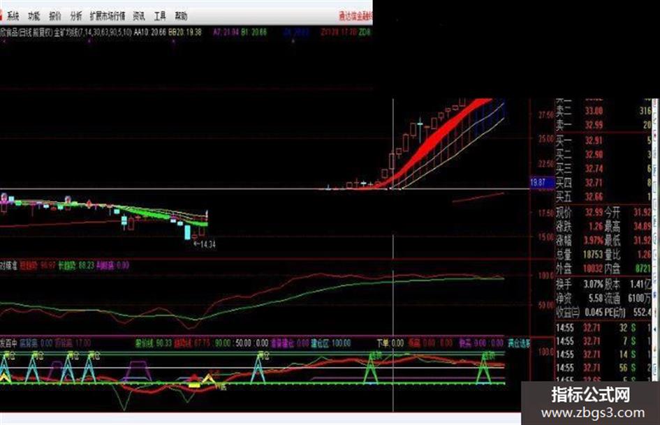 MA2:=EMA(C,2);MA5:=EMA(C,5);MA13:=EMA(C,13);MA30:=EMA(C,30);MA55:=EMA(C,55);YCX:=MA5>=REF(MA5,1);H1:=MAX(MAX(MA5,MA13),MA30);L1:=MIN(MIN(MA5,MA13),MA30);一阳穿三线:= H1<C AND O<L1 AND YCX AND MA2>REF(MA2,1);满仓选股:IF(一阳穿三线,88,0),COLORFFFF00,LINETHICK2;