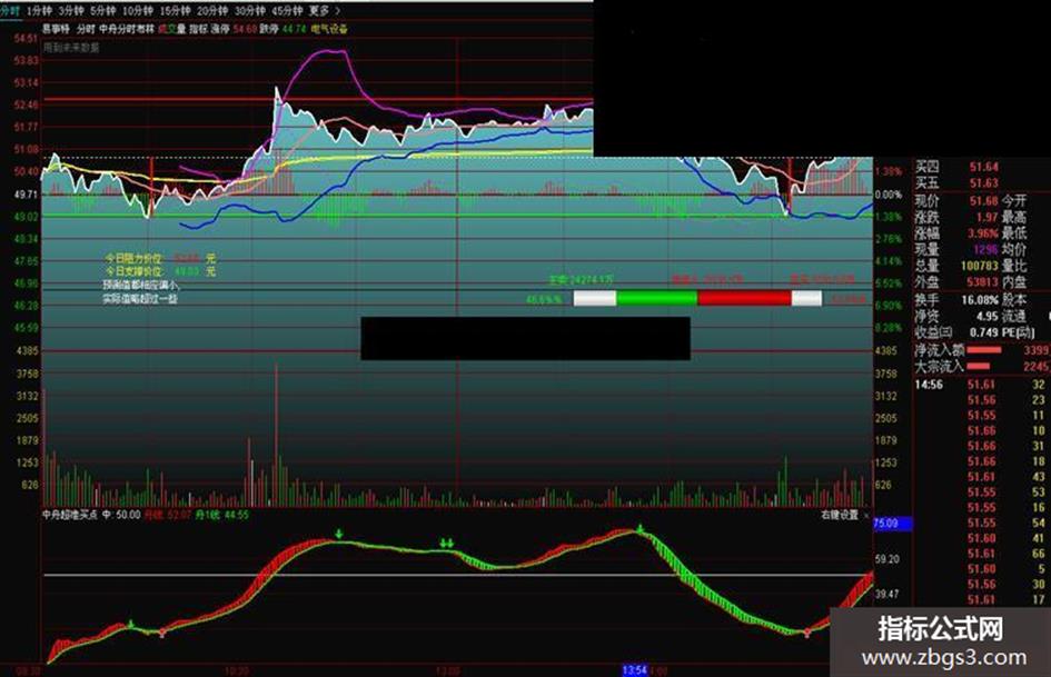 雨中舟分时布林终结版,是雨中舟先生集众家之长,结合布林线、MACD、资金流向、预测支撑和压力点位、分时买卖点于一体的最后定型的指标,图中虚线为MACD的DIFDEA,竖线为MACD。红线为预测顶部压力位,绿线为底部支撑位预测,顶、底两条线遇强势拉升或暴跌,预测值于盘中会有变幻,一定要注意!!支撑位出现红色柱是分时买点,反之,压力出现墨绿色柱是分时卖点。布林线三条线将于开盘后20分钟出现,注意分时均价线运行方向及与上下轨的距离,分时均价线向上,上下轨同时开口放大,主涨。分时均价线向下,上下轨同时开口放大,主跌!注意观察上下轨距离,上下轨同时开口缩小,将是变盘预警信号,多观察就可明白!资金流向,有主买、主卖和净流入,大家一看就懂,不再说明!公式采用完全加密,不喜者绕道