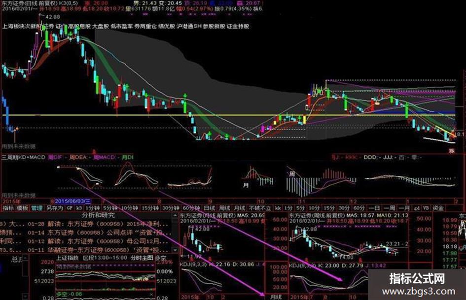 经过一周的研究,终于解决了不同大小指标线之间的叠加。现将经典指标kdj和macd合并到一个副图中,左侧依次为月kdj 周kdj 日kjd .