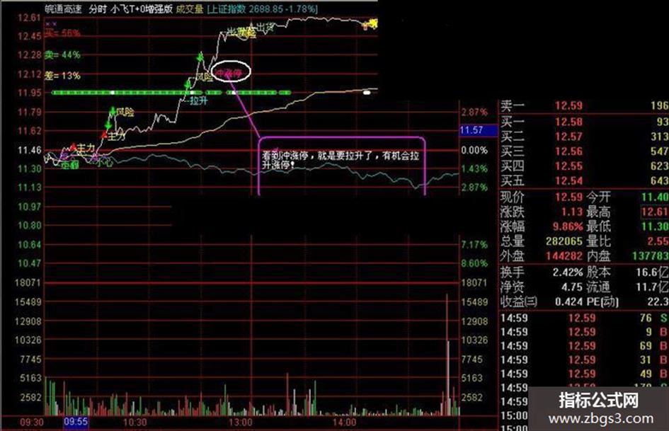小飞T+0增强版'为分时主图指标,指标公式只能用于电脑版通达信软件上,本指标增加了拉升,冲涨停,出货等信号,更加方便的让我们作出判断,下图有重要提示,本指标有个动态函数DYNAINFO反映的是最新的财务数据,指标无加密,不喜勿下!现在我说说T+0的含义就是我们现在A股交易规则是T+1,而公式怎么叫T+0。比如昨天买了1000股,今天冲高卖出1000股,再低位买回1000股;或是先买入,待冲高再卖出;来回滚动操作,降低成本!这就是T+0的方法与用途。
