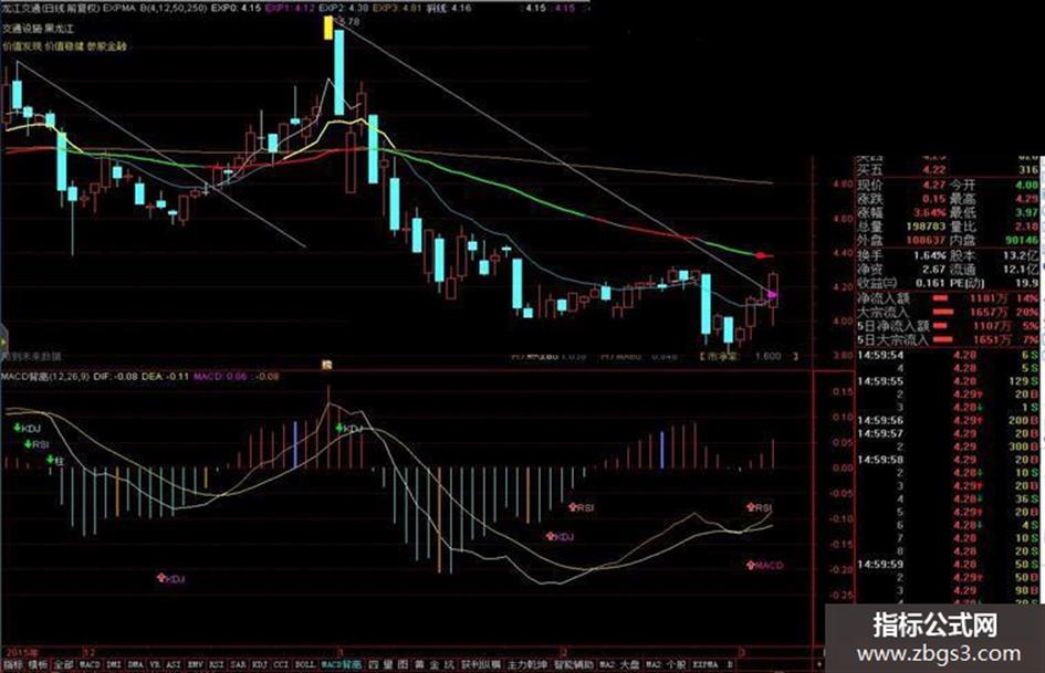 DRAWTEXT(D2>0,HHV(DIF,60)*0.60,'..KDJ'),COLORFFFF99;{KDJ顶背离}