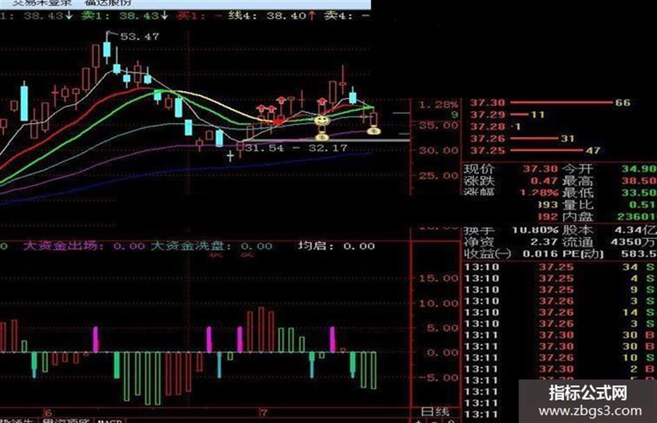 大资金出场:IF(CROSS(AA,BB),5,0),STICK,LINETHICK4,COLORMAGENTA;