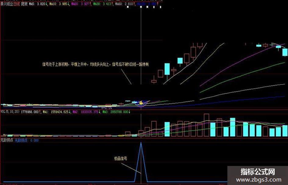 1、信号出现在上涨初期或上涨中途,各均线多头向上,平缓上升中,均线比较流畅,各均线之间的间距比较均匀的,没有特大特小的间距。