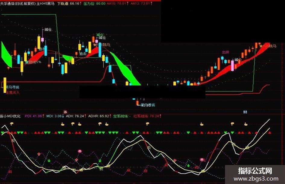 空军战场:IF(MDI>REF(MDI,1) AND PDI<REF(PDI,1),ADX,DRAWNULL),LINETHICK2,COLORGREEN;