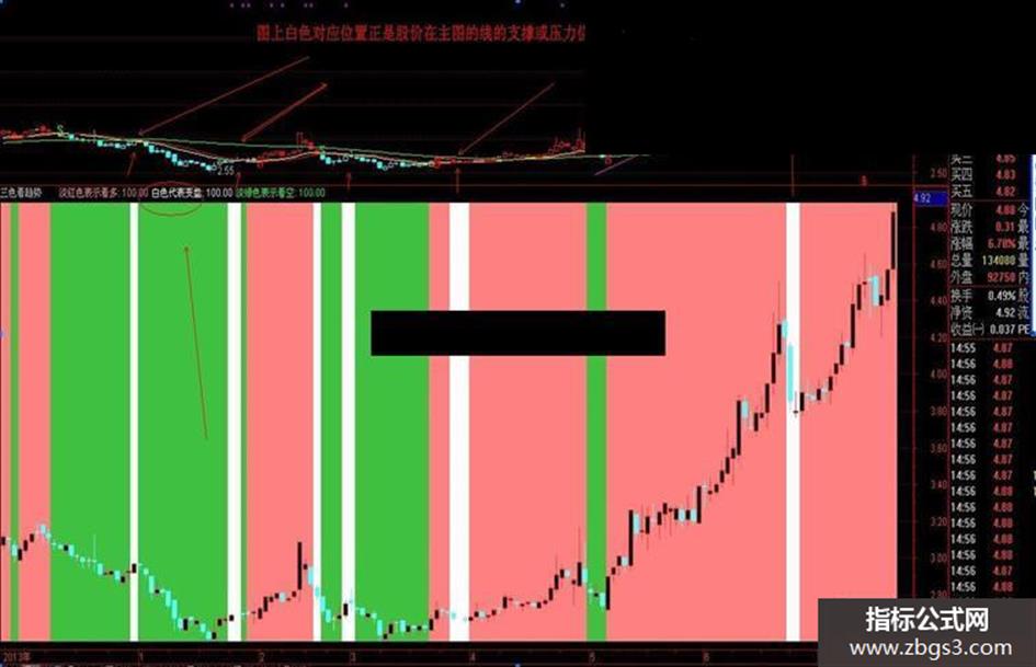 粉红色是上升持股趋势,相当于我主图的B点段,绿色代表下降趋势,相当于主图的S点段。而它多了个白色,我看了下,白色出现的位置在我的主图上,不是顶在压力线,就是回到支撑线的位置,如果继续向上或向下,就会打破主图 的B S点了,应该是非常高明的。提示我们要看好走势。
