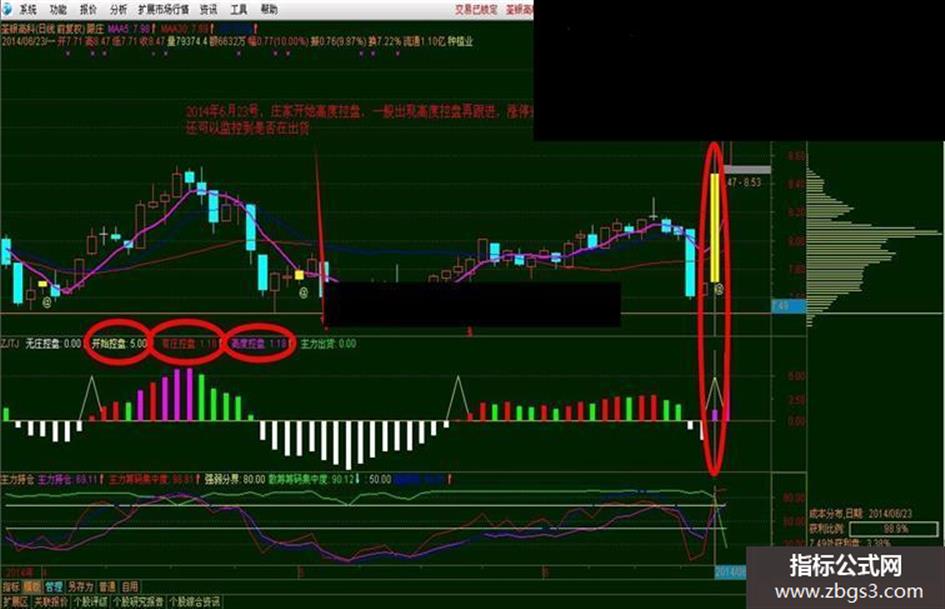 高度控盘:IF(VAR2>50 AND COST(85)<CLOSE AND 控盘>0,控盘,0),COLORFF00FF,NODRAW;
