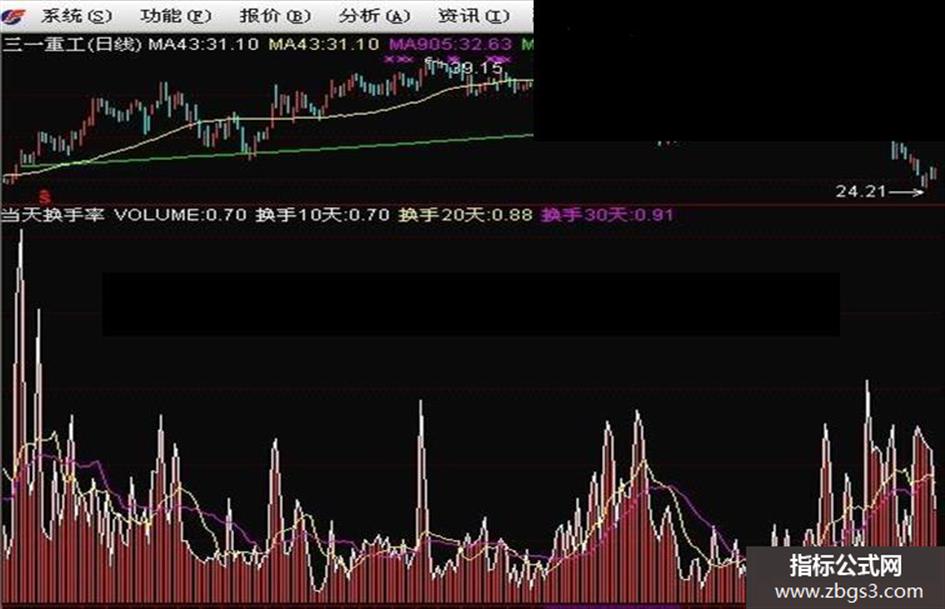 红色柱子是当天的换手率,黄色线是10天平均换手率,粉红色线是20天平均换手率 VOLUME:SUM(100*V/CAPITAL,1),COLORSTICK; 换手1天均线:MA(VOLUME,1); 换手10天均线:MA(VOLUME,10); 换手20天均线:MA(VOLUME,20);