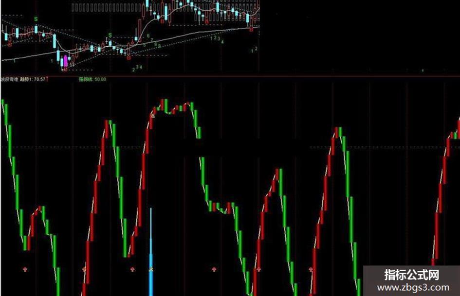 STICKLINE(REF(趋势1,1)< 趋势1, 趋势1,REF(趋势1,1),2.0,0),COLOR000077;