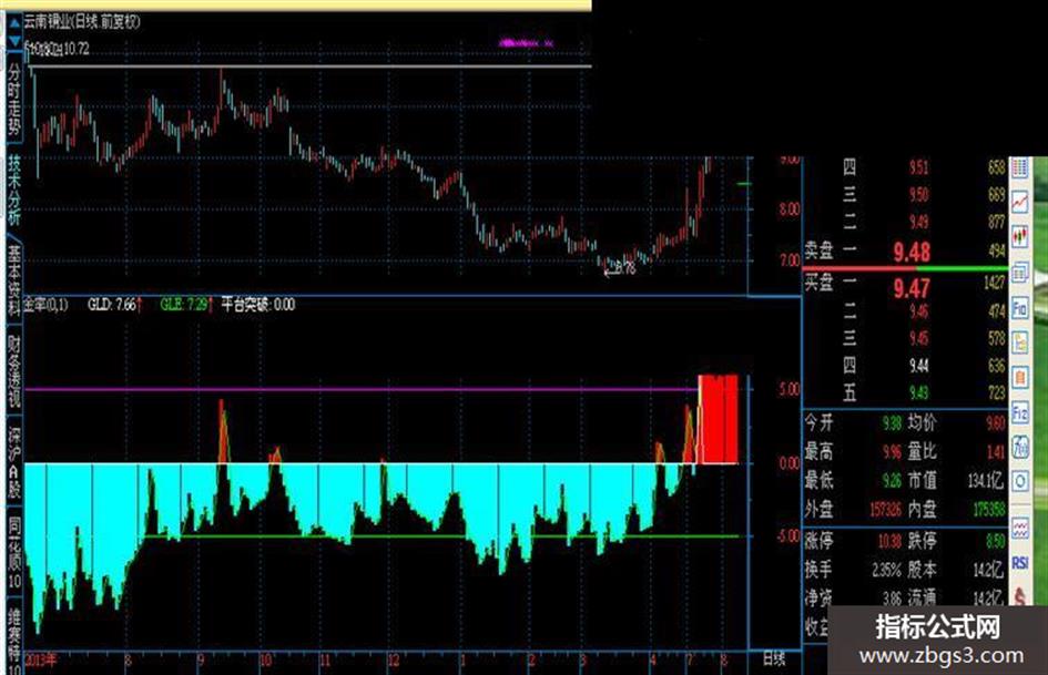 平台突破:IF(CROSS(GLD,5)AND (COUNT(ABS(GLD)<5,30)>24,3),GLD,0),COLORWHITE;