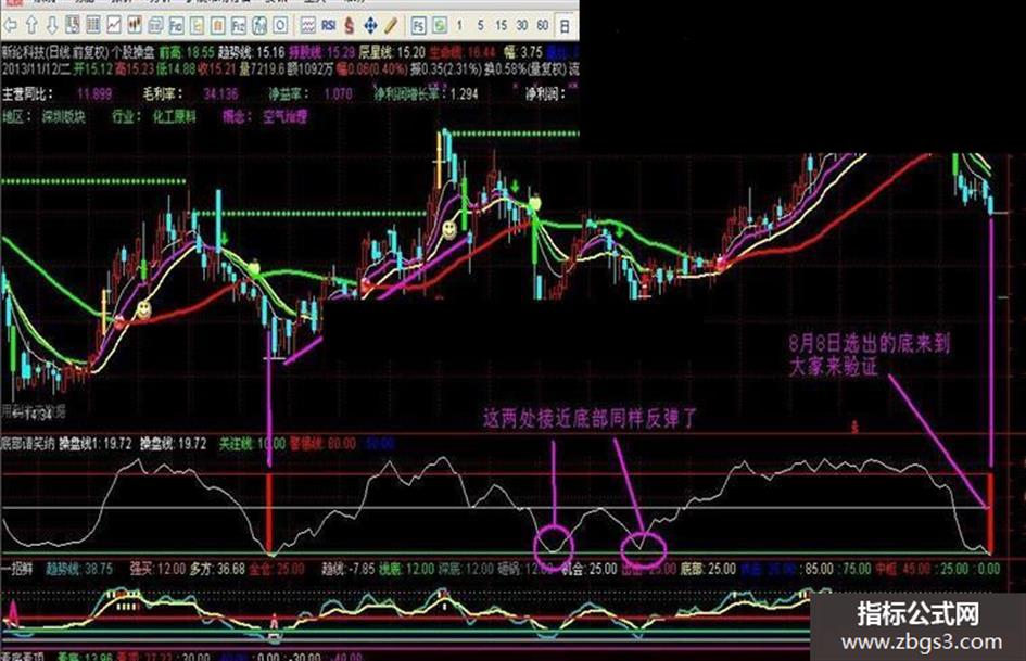 出现红色柱表示阶段底部来到,第二天就可以轻仓打底仓,最好10%仓位,当然结合其他指标可以加大仓位,出现笑脸时可以超过半仓。因为此种底部的出现反弹的概率非常高,不贪心赚个4%出局!当然也可以逐步止盈,进入上升通道再加仓!