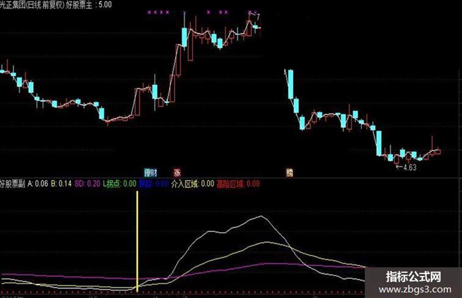 L拐点: IF(VAR1,VAR3 AND CROSS(A,B) AND B<0.6 AND B>VAR2,0),STICK,LINETHICK3,COLOR00FF00;