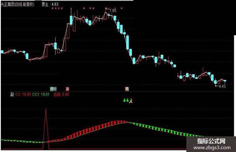 出击:IF((CROSS(CC,CC1) AND (CC1 < 顶) ),80,0),COLORRED;