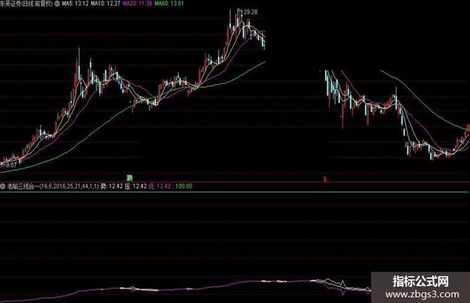 X_1:=1171002; X_2:=IF(DATE<X_1,1,DRAWNULL); X_3:=IF(DATE<X_1,1,DRAWNULL); X_4:=VOL*(OPEN+CLOSE+HIGH+LOW)*X_2/4; 势:EMA(X_4,21)*X_2/EMA(VOL,21); 压:6*HHV(势,2)-5*势*X_2; 托:2*势-压*X_2; 100;