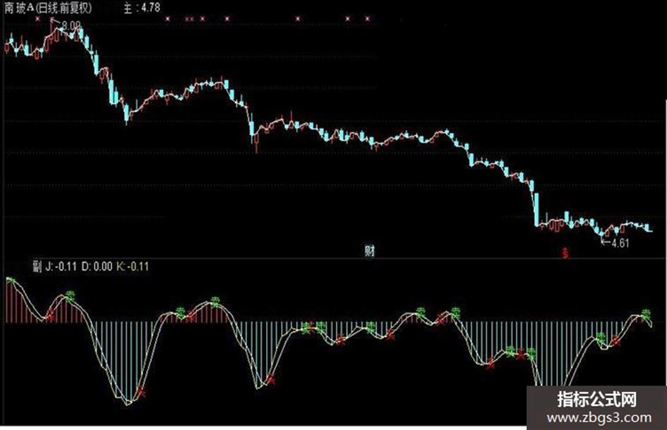 VAR1:=(2*CLOSE+HIGH+LOW)/4; VAR2:=EXPMA(EXPMA(EXPMA(VAR1,4),4),4); J:(VAR2-REF(VAR2,1))/REF(VAR2,1)*100, COLORSTICK; D:MA(J,3); K:MA(J,1); DRAWTEXT(CROSS(K,D),K,'买'),COLORRED; DRAWTEXT(CROSS(D,K),D,'卖'),COLORGREEN;