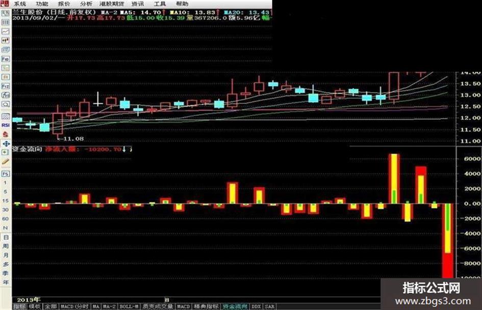 优化后的通达信“资金流向”指标比通达信系统自带的“zjLX—资金流向”指标更加直观。