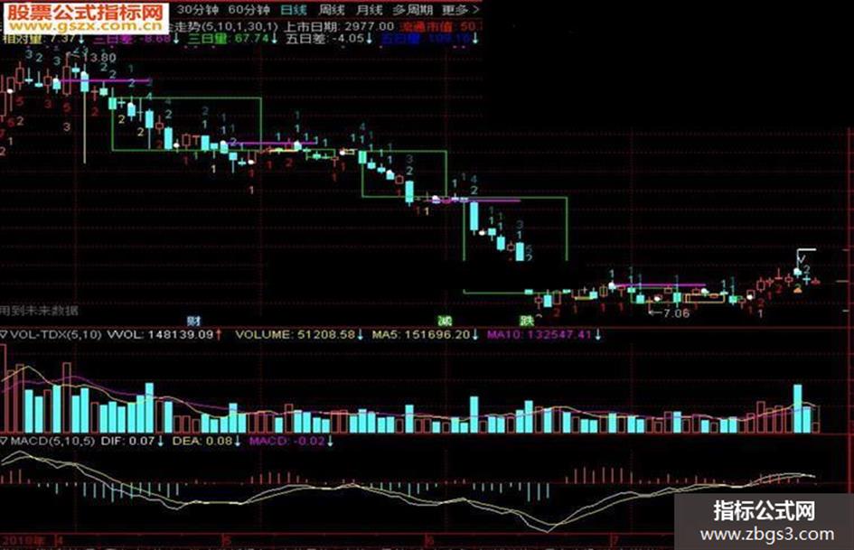 根据DDX资金流入和流出,在主图上画出资金进出的矩形,黄色矩形资金流入,青色矩形资金流出,标示了周月的开盘价,表示了每日相对量。