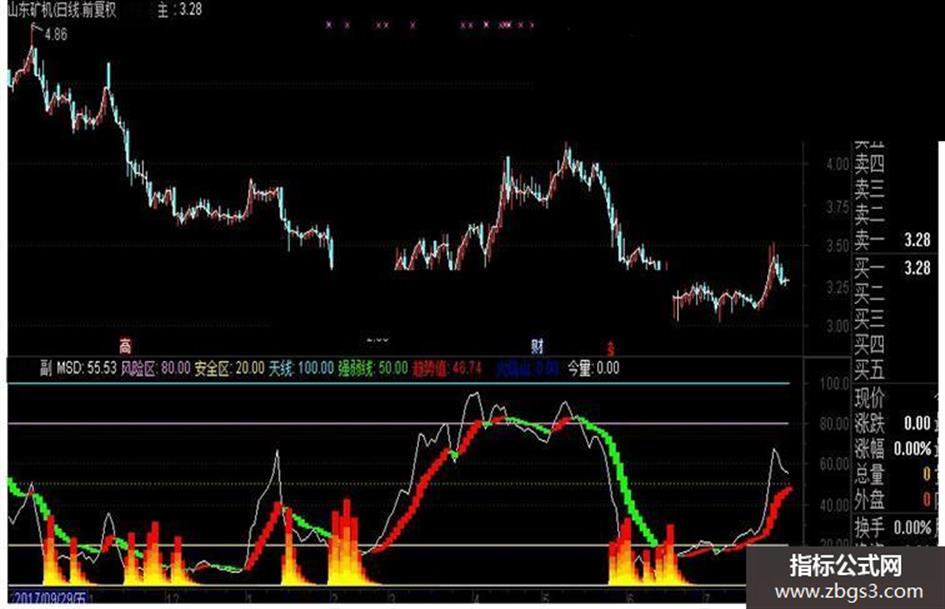 当满足条件火焰山>0时,在0和今量*0.8位置之间画柱状线,宽度为8,0不为0则画空心柱. COLOR0066FF