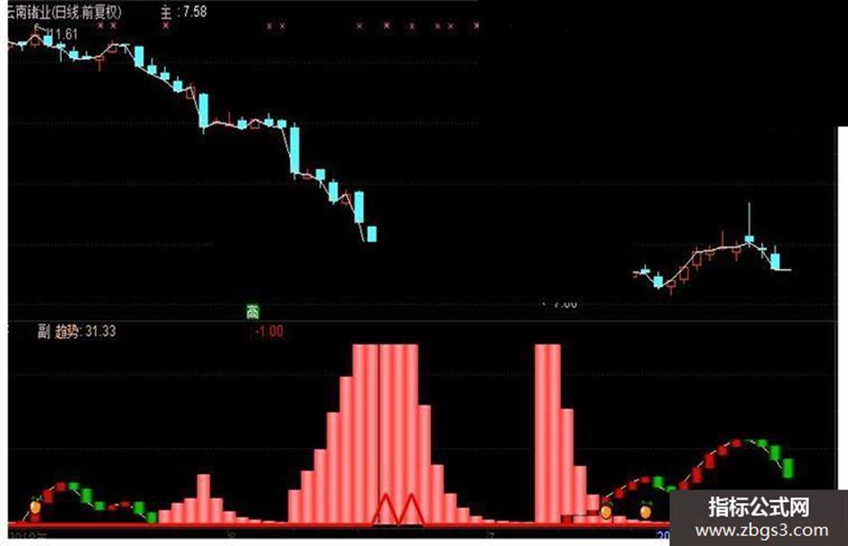 当满足条件1日前的趋势>趋势时,在趋势和1日前的趋势位置之间画柱状线,宽度为3.2,0不为0则画空心柱.,COLOR003300