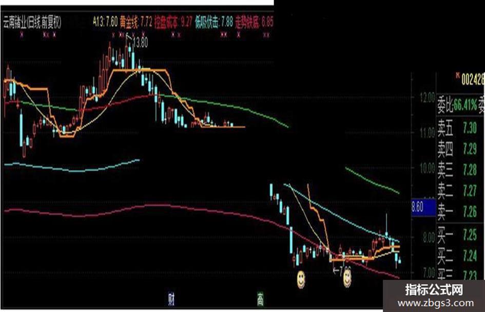 黄金线:(HHV(VAR1A,12)),LINETHICK2,COLOR0080FF;VAR1:=EMA(AMOUNT/VOL/100,3);