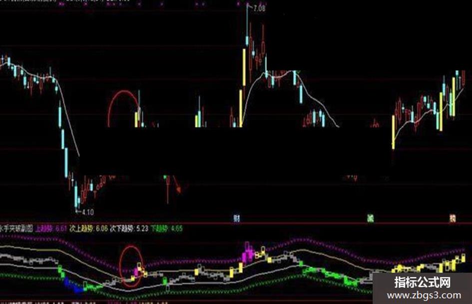 如何判断是龙头股,我们找出涨停股后,使用水头突破副图,已经突破上轨,变为紫色的,我们称为是龙头股。