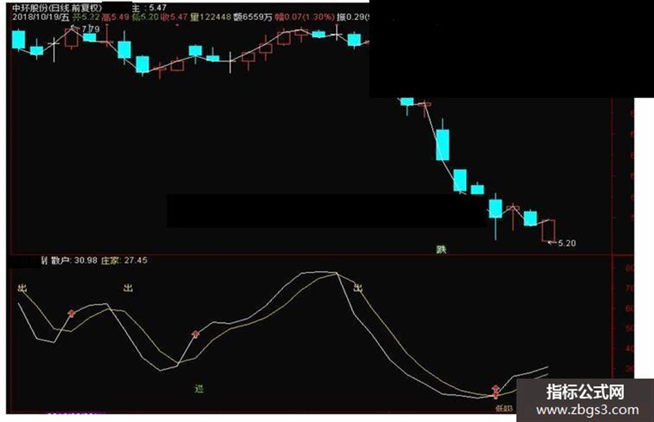 DRAWTEXT(CROSS(庄家,散户) AND 散户>40 AND 71>散户,70,'出'),COLOR00FFFF;