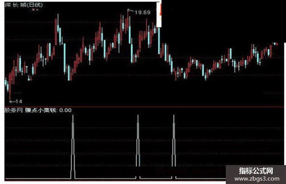 小菜钱:=(3*(SMA(((C-LLV(L,11))/(HHV(H,11)-LLV(L,11))*100),3,1))-2*(SMA((SMA(((C-LLV(L,11))/(HHV(H,11)-LLV(L,11))*100),3,1)),3,1))); 赚点小菜钱:CROSS(小菜钱,-5);